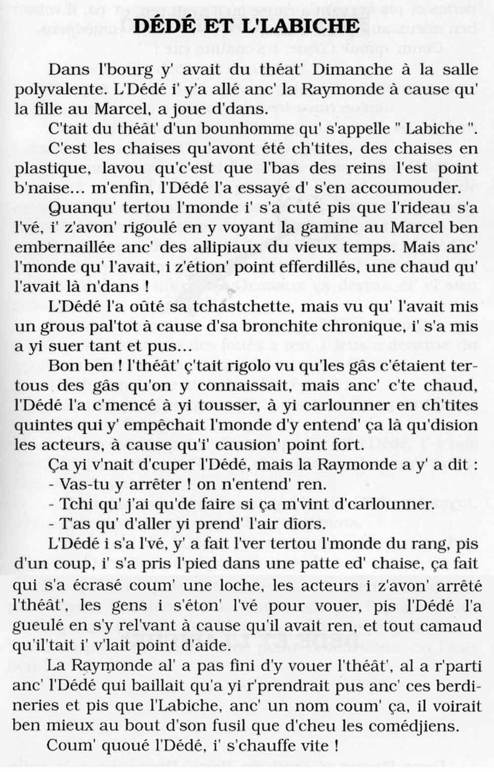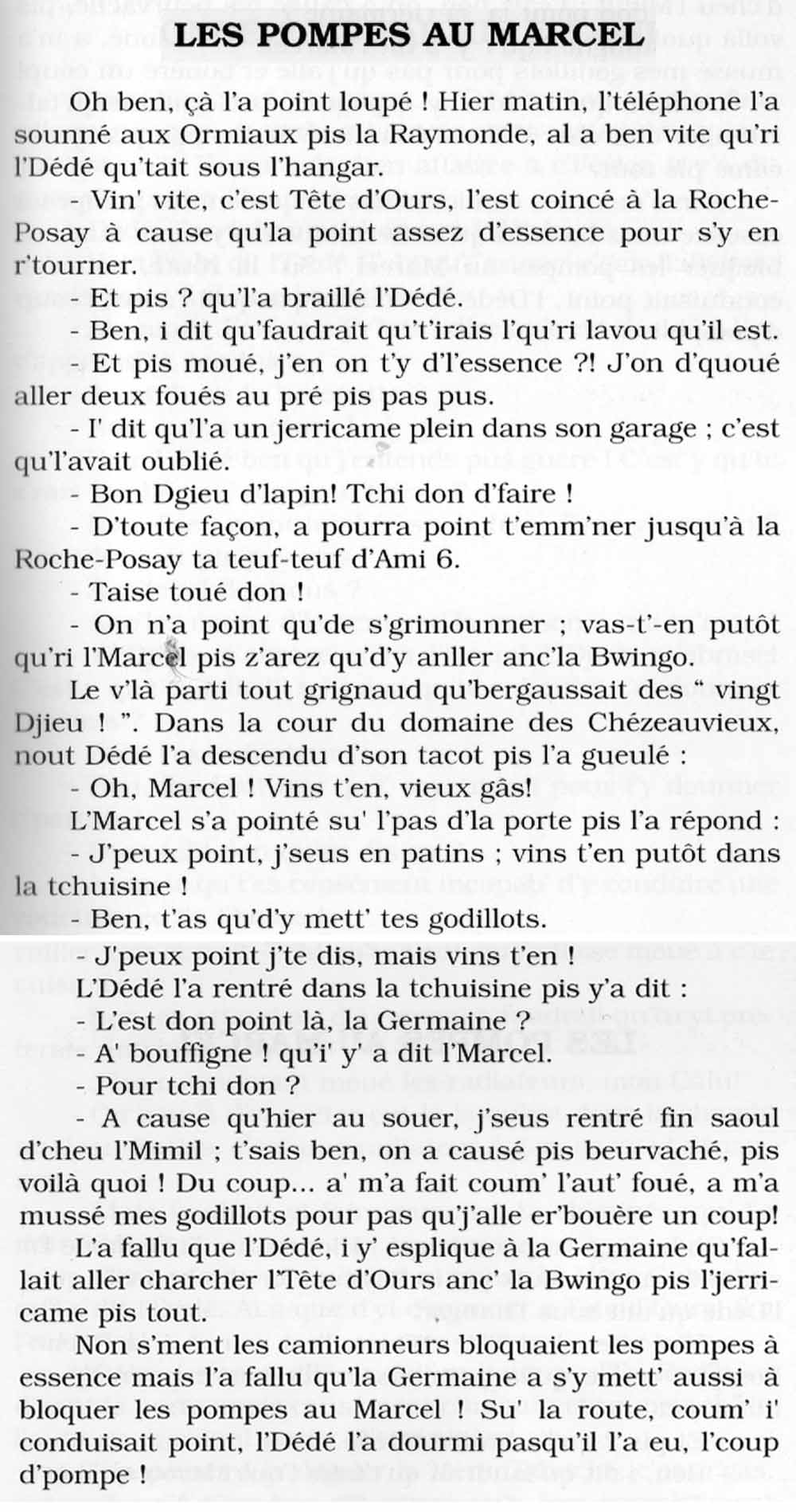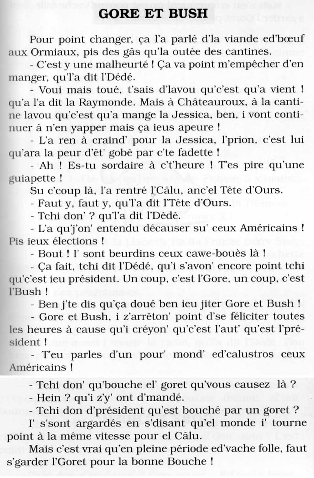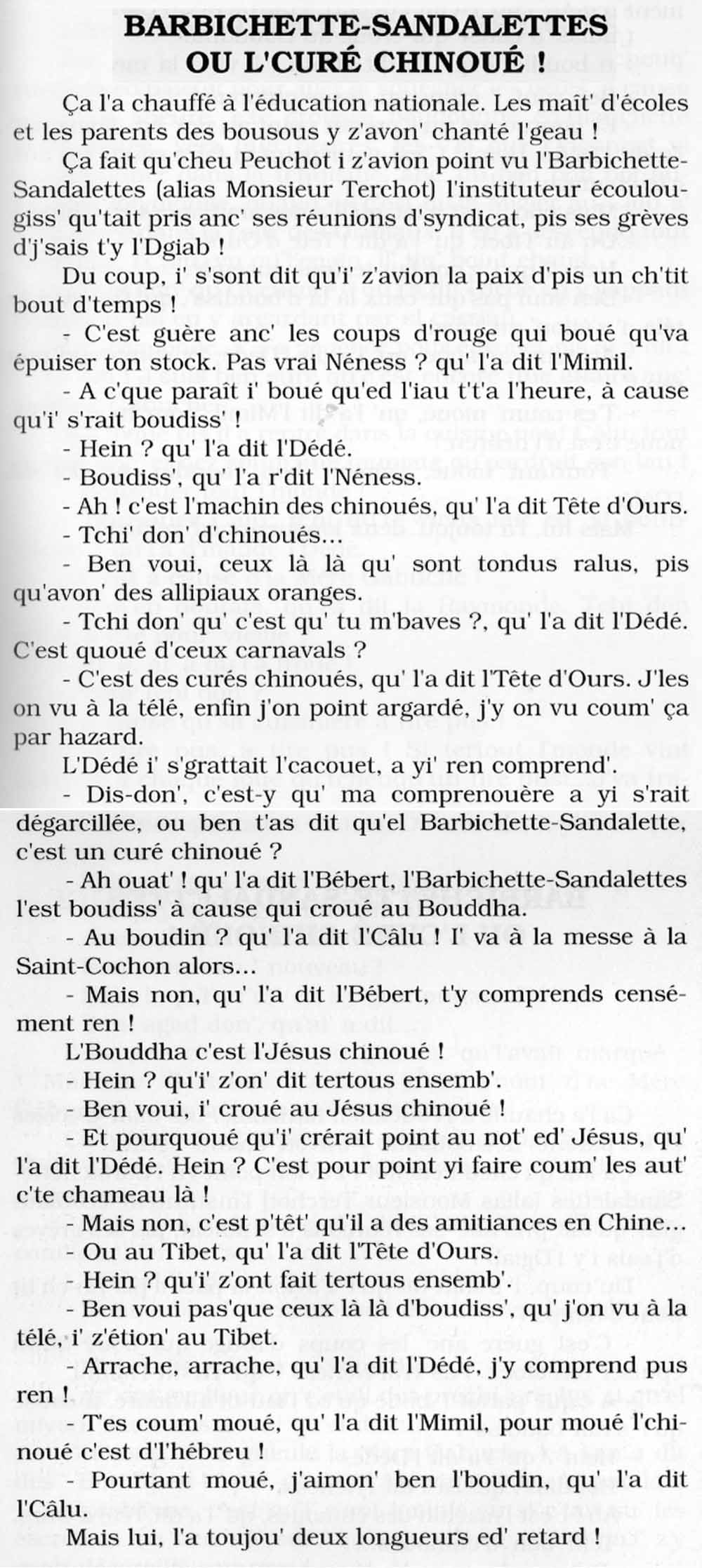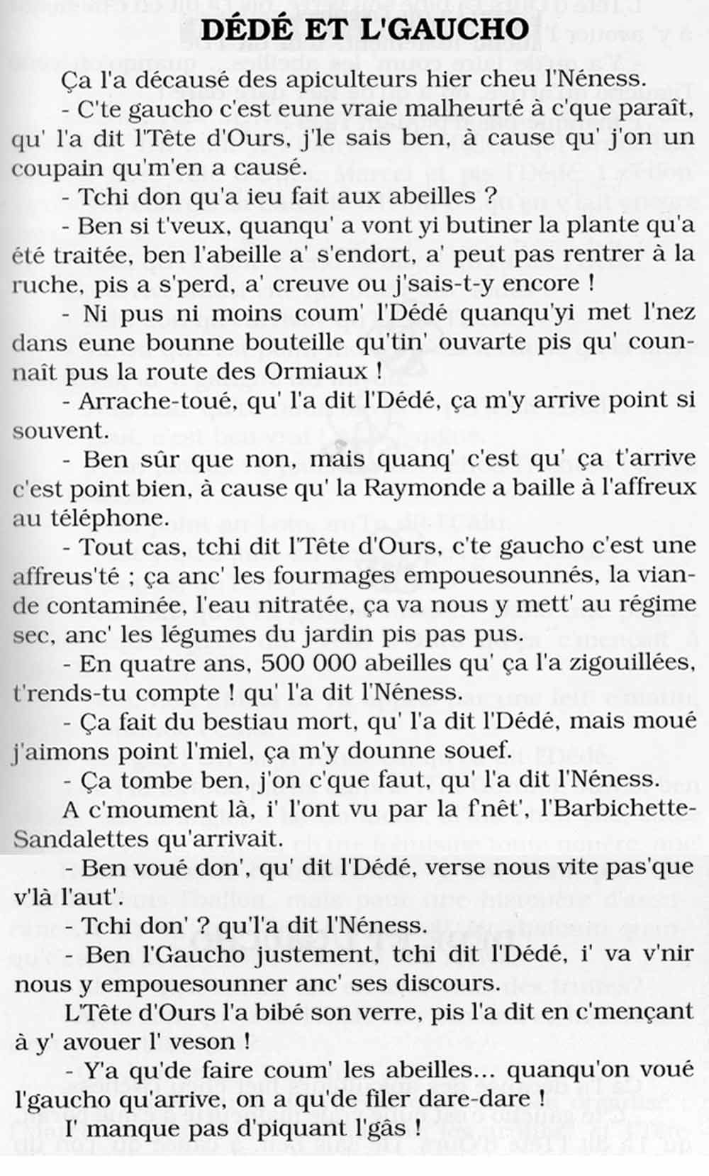 Quand t'es Berrichon :Tu dis: ça va ti ?? oui pi toué? ça caille pas chaud, s'tantôt, un' agadiau, t'envouès la drôillère charcher (ou ben qu'ri) un sieau d'ieau qu'al' aura braum'ment rempli, tu mets des poummes dans l'pochon ou ben dans l'pénier, tu mets des patins, tu t'attifes de deux sabiots, d'un pal’tiau et pi d'un chapieau, tu dis "eul’gamin" ou ben eul' chti drôle, du froumage de chieuve, tu peux traiter un drôle de berlaudiot, tu biges tes proches (su' l'bigeois), tu chagnes, tu rag'nasses, tu bouzines (ou ben tu tazoune) ! et pi quand tiras couper la bouchture t'ouvriras le barieau et tu douneras des blettes au taurriau ac la bérouette avant t'prende un' agadiau ou ben une arnâpée su ste dgeule binsur !!!