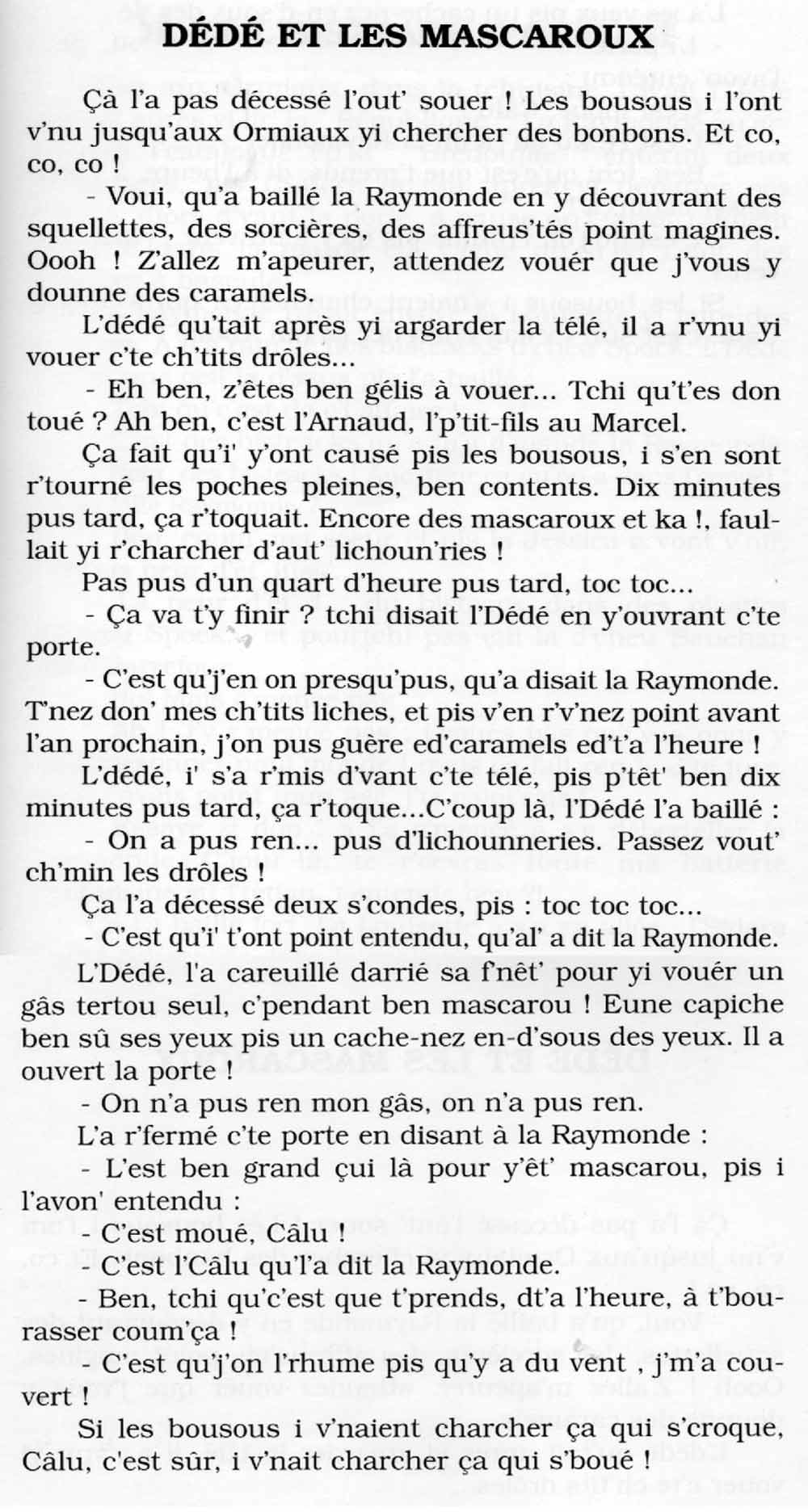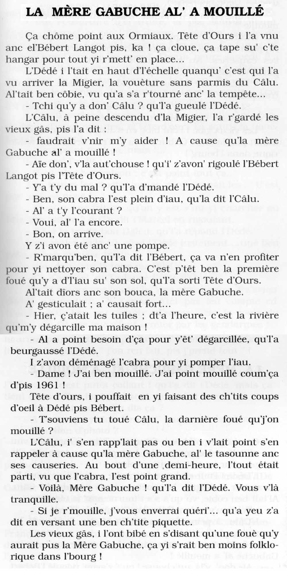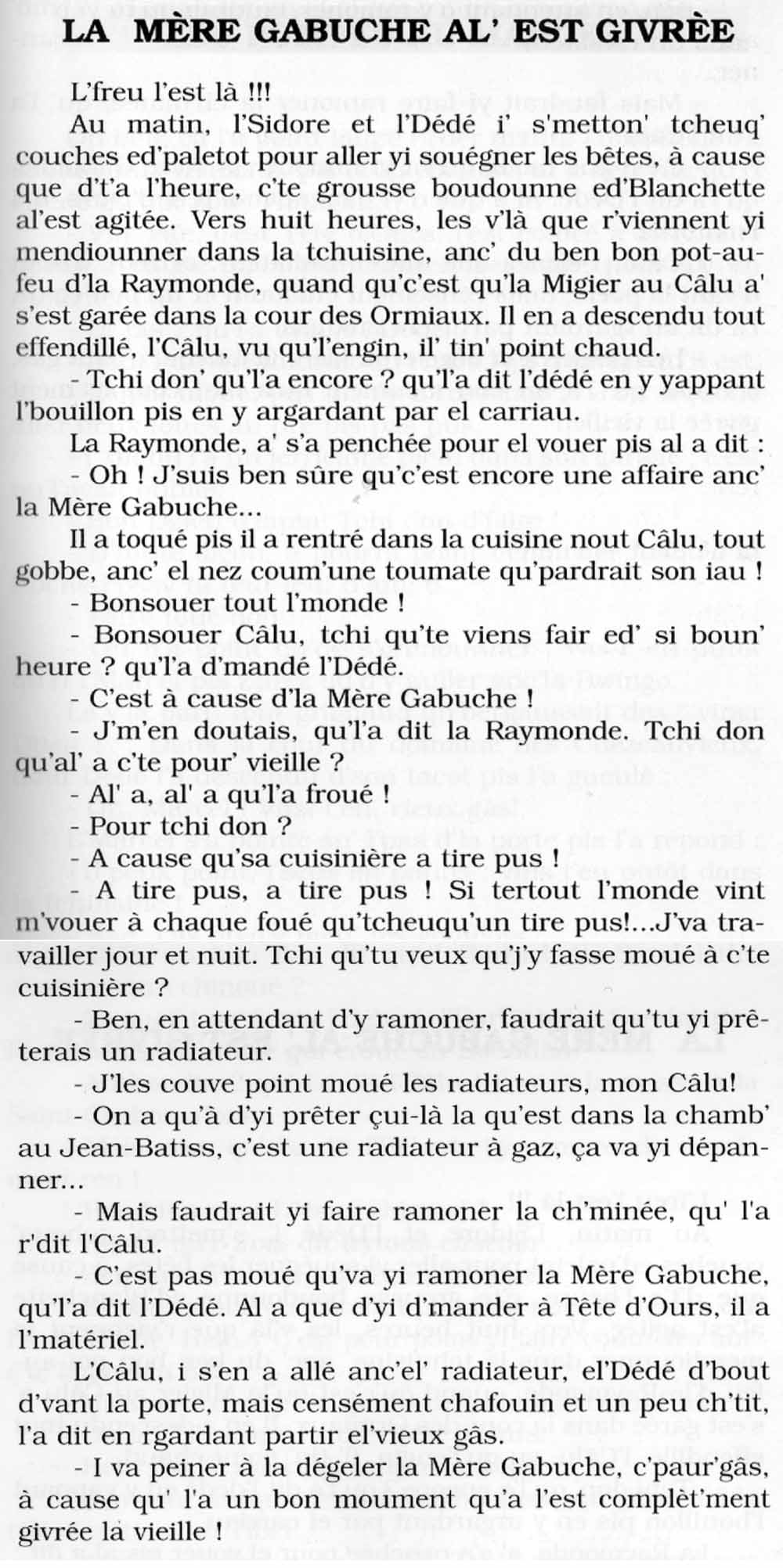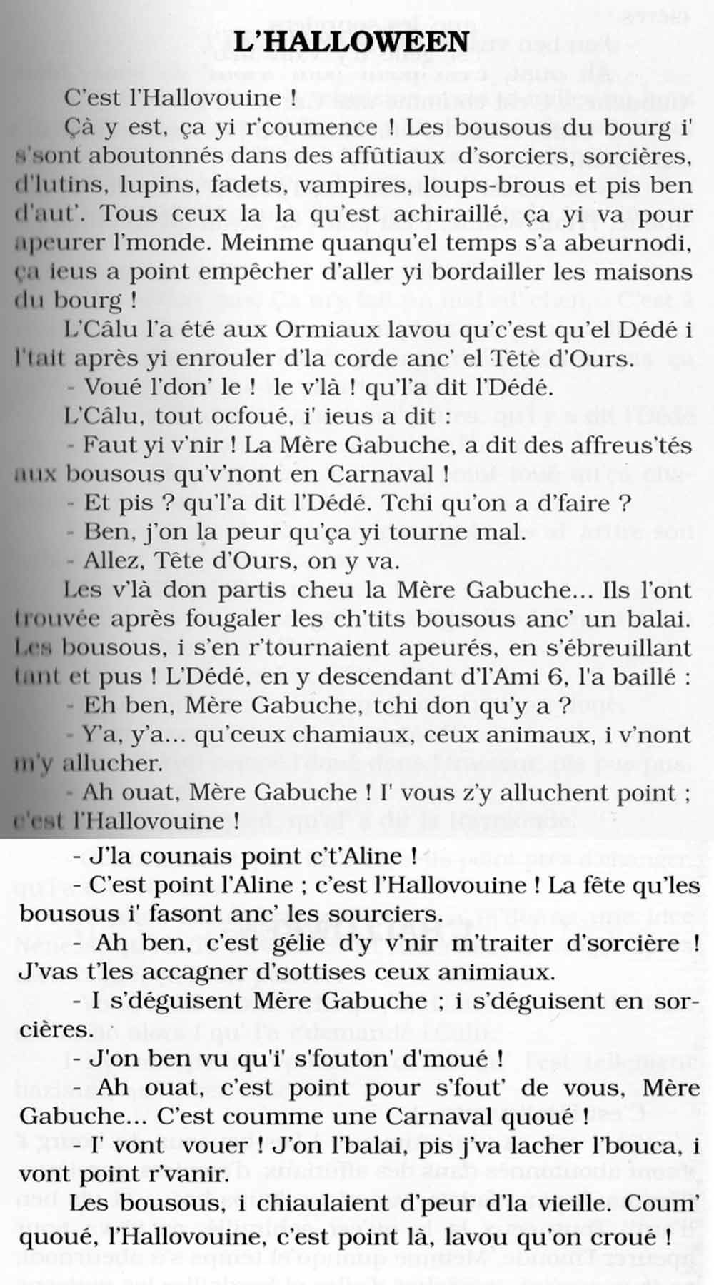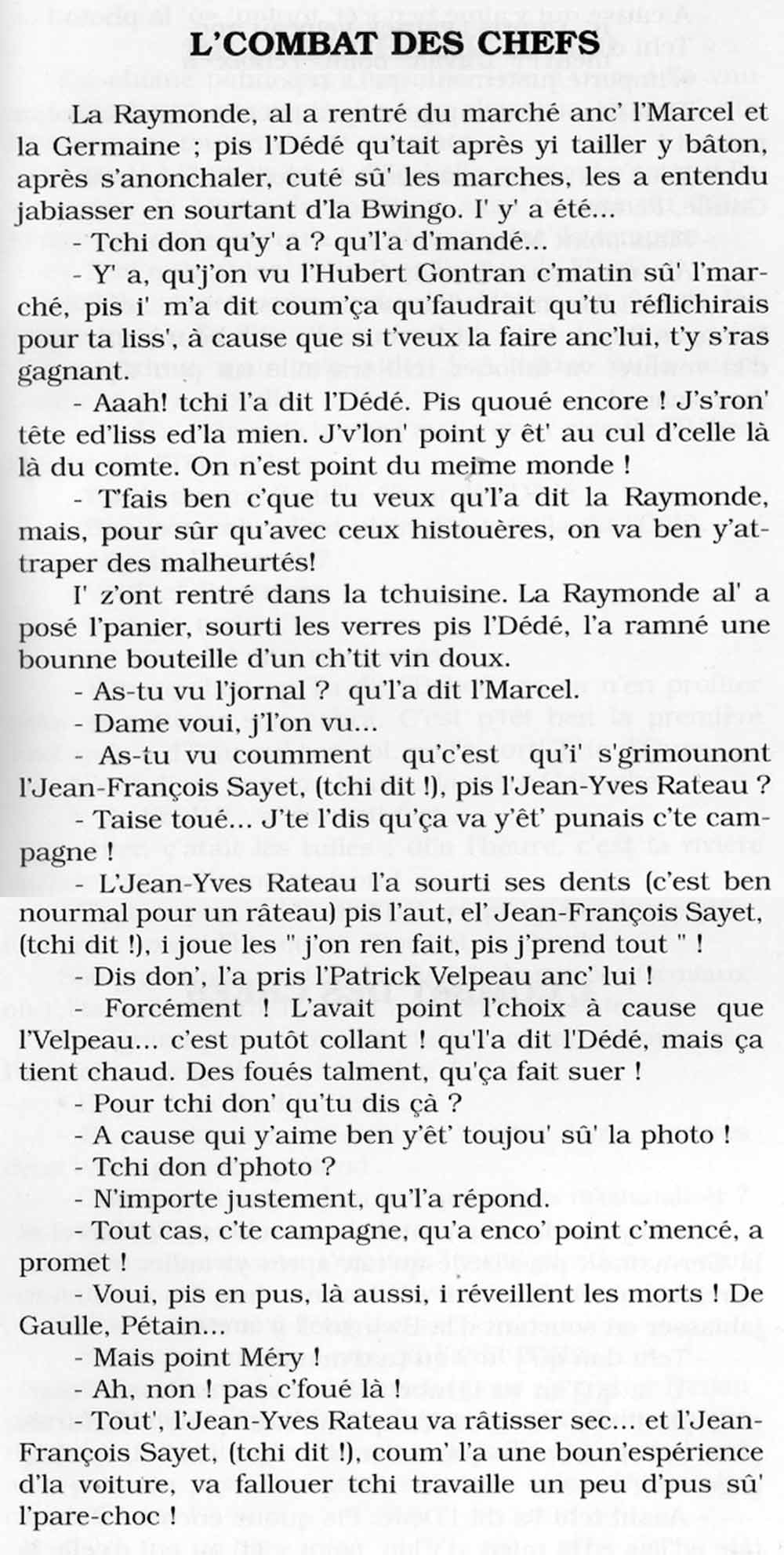 Quand t'es Berrichon :Tu dis: ça va ti ?? oui pi toué? ça caille pas chaud, s'tantôt, un' agadiau, t'envouès la drôillère charcher (ou ben qu'ri) un sieau d'ieau qu'al' aura braum'ment rempli, tu mets des poummes dans l'pochon ou ben dans l'pénier, tu mets des patins, tu t'attifes de deux sabiots, d'un pal’tiau et pi d'un chapieau, tu dis "eul’gamin" ou ben eul' chti drôle, du froumage de chieuve, tu peux traiter un drôle de berlaudiot, tu biges tes proches (su' l'bigeois), tu chagnes, tu rag'nasses, tu bouzines (ou ben tu tazoune) ! et pi quand tiras couper la bouchture t'ouvriras le barieau et tu douneras des blettes au taurriau ac la bérouette avant t'prende un' agadiau ou ben une arnâpée su ste dgeule binsur !!!