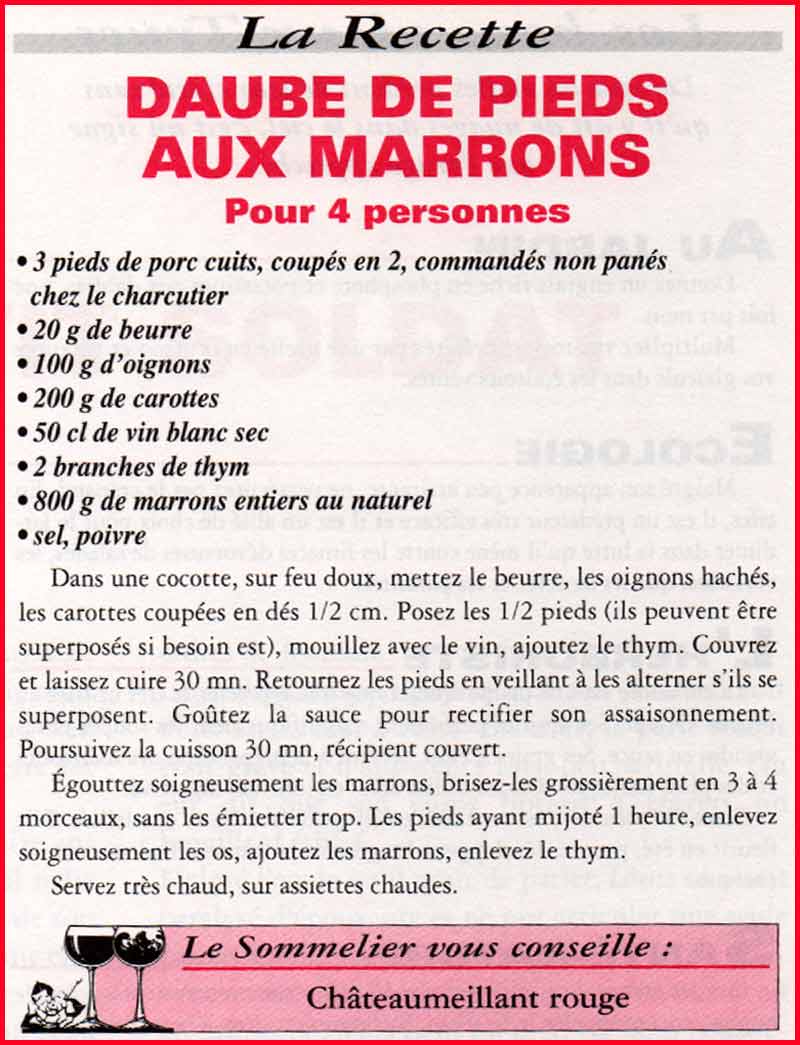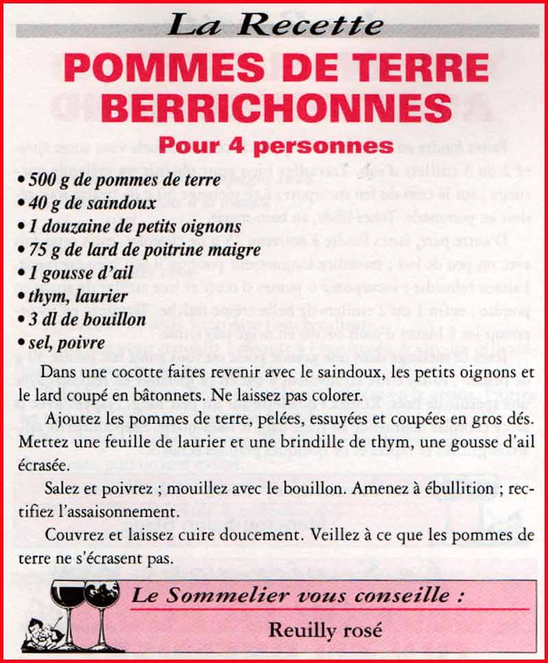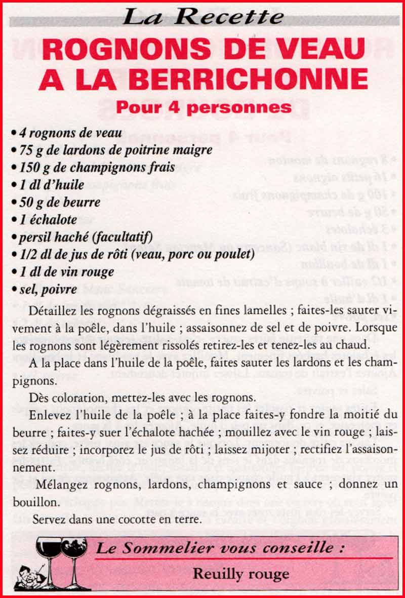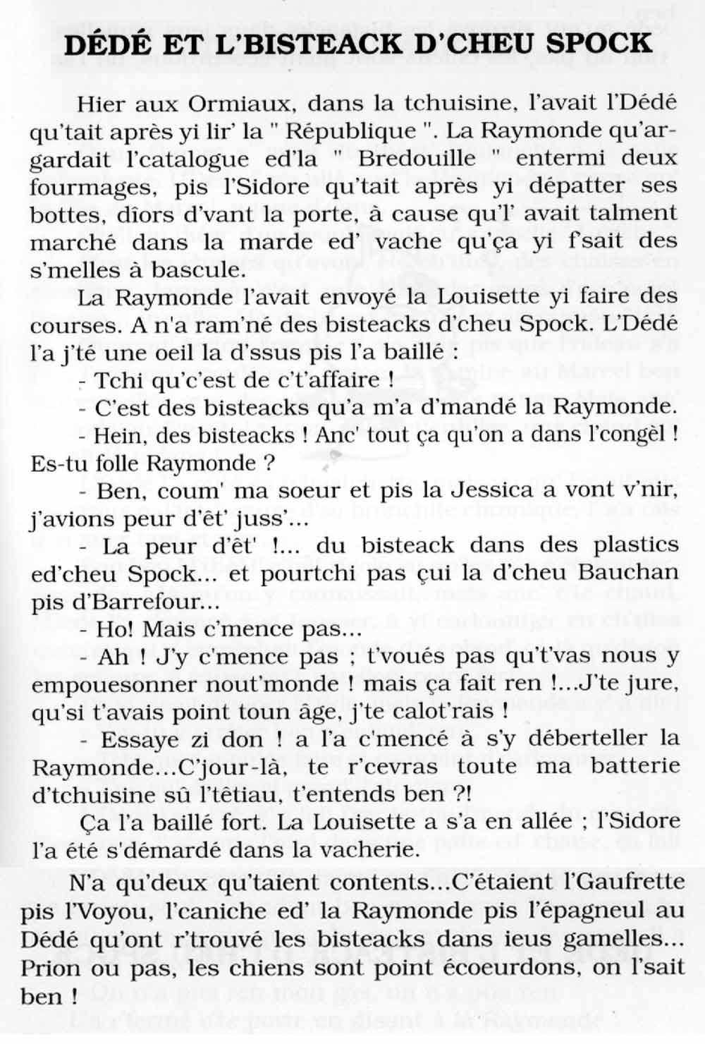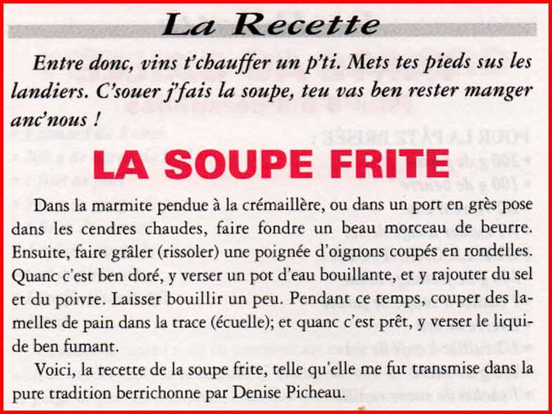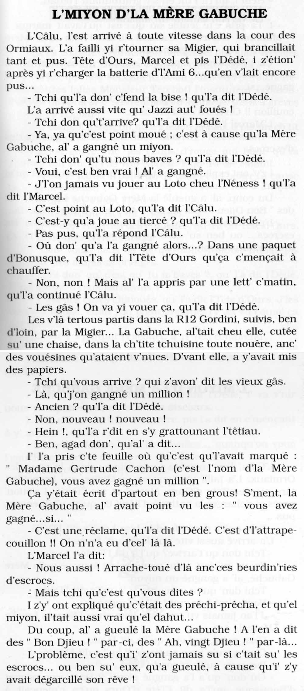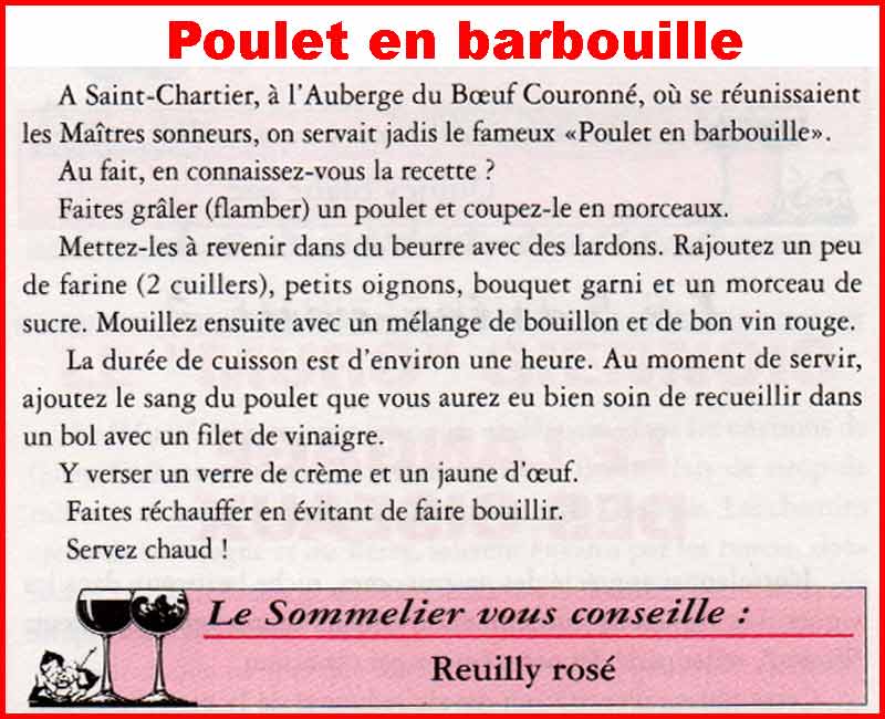 Quand t'es Berrichon :Tu dis: ça va ti ?? oui pi toué? ça caille pas chaud, s'tantôt, un' agadiau, t'envouès la drôillère charcher (ou ben qu'ri) un sieau d'ieau qu'al' aura braum'ment rempli, tu mets des poummes dans l'pochon ou ben dans l'pénier, tu mets des patins, tu t'attifes de deux sabiots, d'un pal’tiau et pi d'un chapieau, tu dis "eul’gamin" ou ben eul' chti drôle, du froumage de chieuve, tu peux traiter un drôle de berlaudiot, tu biges tes proches (su' l'bigeois), tu chagnes, tu rag'nasses, tu bouzines (ou ben tu tazoune) ! et pi quand tiras couper la bouchture t'ouvriras le barieau et tu douneras des blettes au taurriau ac la bérouette avant t'prende un' agadiau ou ben une arnâpée su ste dgeule binsur !!!