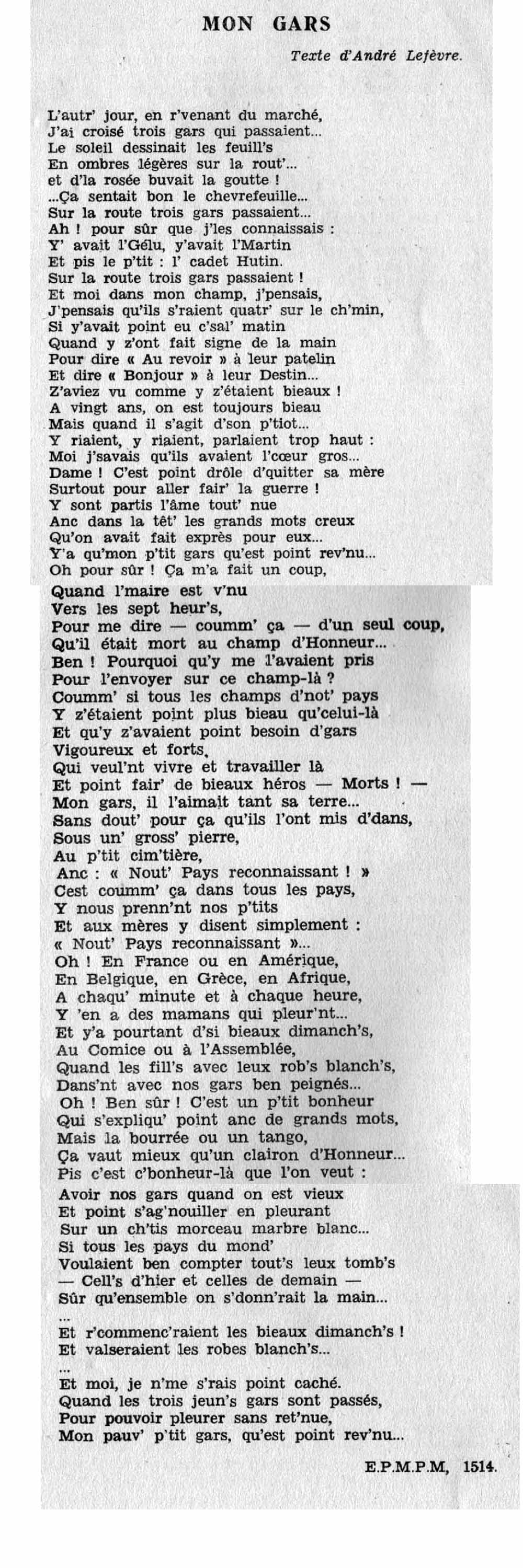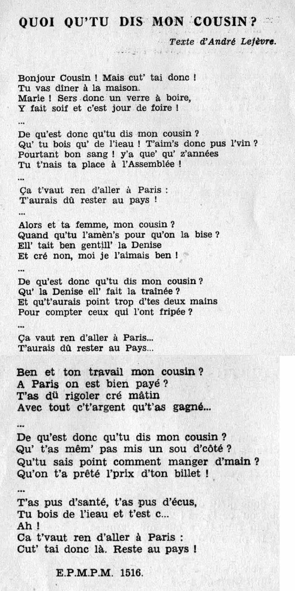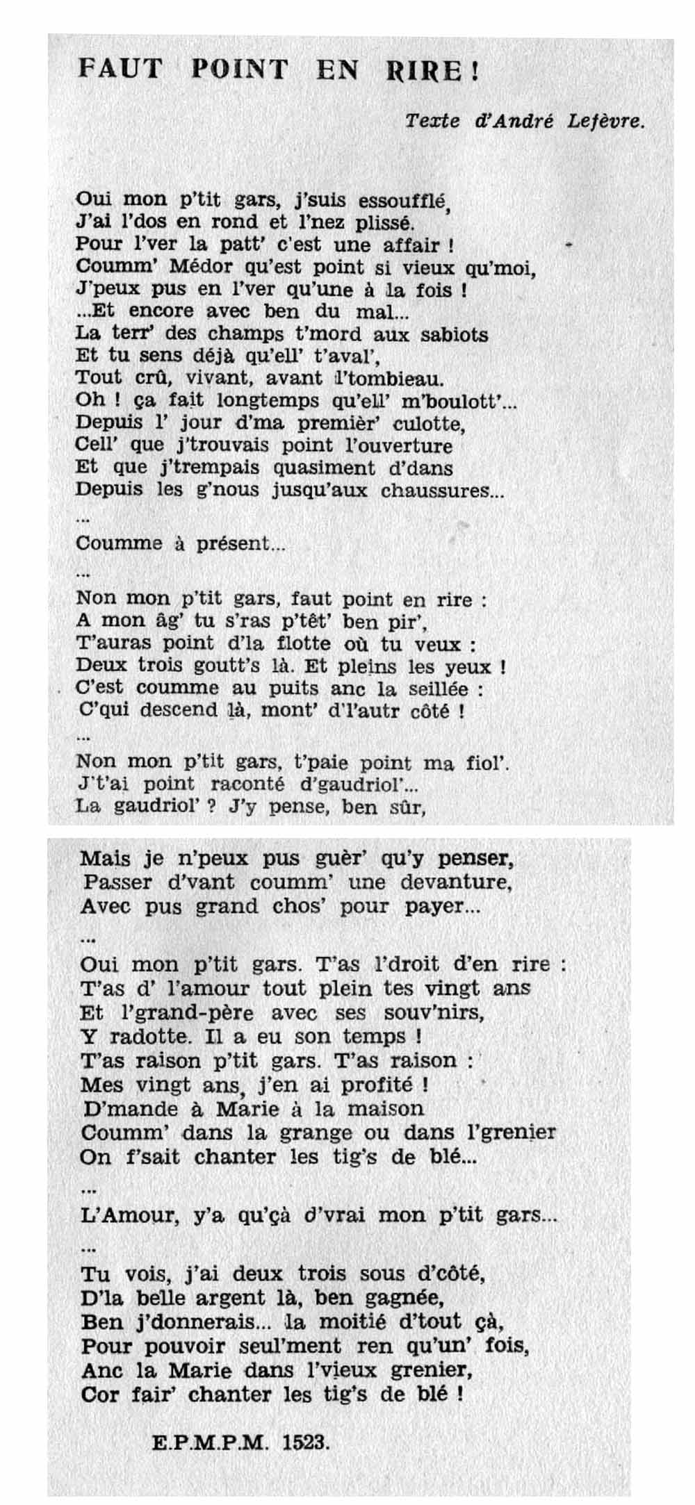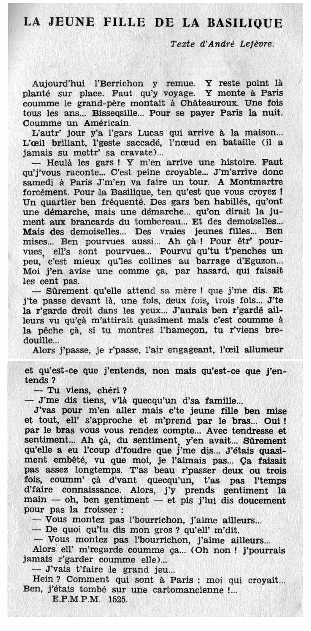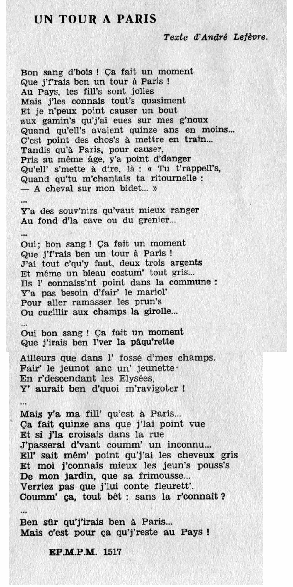 PAYS DU BERRY 12 poèmes et monologues de ANDRE LEFEVRE Créés et enregistrés par Patrick RAYNAL Mon gars Bouche cousue Quoi qu'tu dis mon cousin Un tour à Paris Les 20 millions Not' Bijou Si la Marie... Y sont r'venus ! J'veux un moufflet ! Faut point en rire Dis m'sieur, aime la ben... La jeune fille de la basilique |